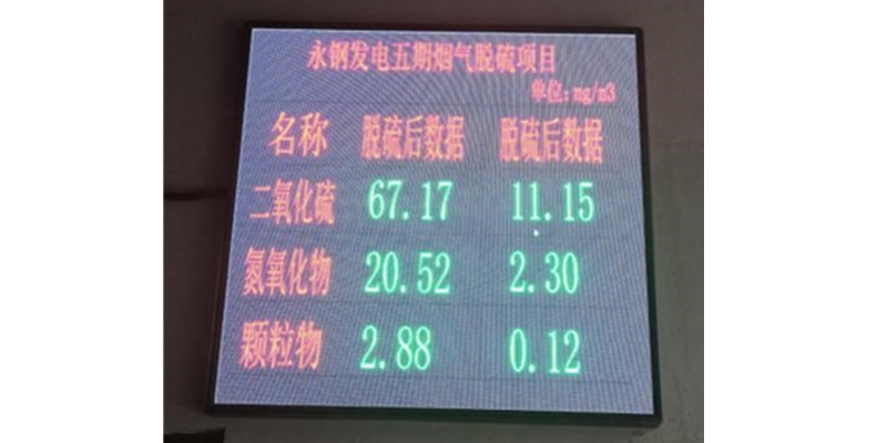 公司EPC總承包的聯(lián)峰鋼鐵有限公司電力廠5#煙氣脫硫項(xiàng)目自投運(yùn)以來(lái),通過(guò)對(duì)鍋爐煙氣脫硫前后參數(shù)的采集與對(duì)比,對(duì)脫硫劑小蘇打的噴吹量實(shí)現(xiàn)自動(dòng)調(diào)節(jié),經(jīng)過(guò)一個(gè)月的調(diào)試,除塵器出口煙氣含塵顆粒物、SO2,氮氧化物的含量均低于國(guó)家超低排放行業(yè)標(biāo)準(zhǔn),達(dá)到公司承諾運(yùn)行保證值,滿足性能考核要求。脫硫后的排放數(shù)據(jù)實(shí)時(shí)顯示到大屏,對(duì)外公布。
