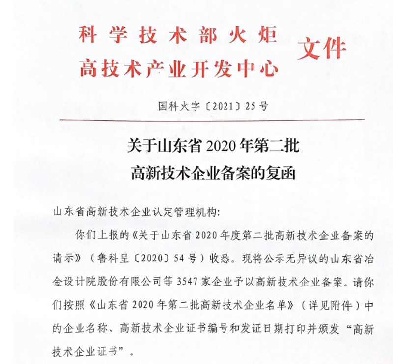 1月15日,根據(jù)全國高新技術(shù)企業(yè)認(rèn)定管理工作領(lǐng)導(dǎo)小組辦公室印發(fā)的《關(guān)于山東省2020年第二批高新技術(shù)企業(yè)備案的復(fù)函》,公司順利通過了2020年度國家高新技術(shù)企業(yè)認(rèn)定。