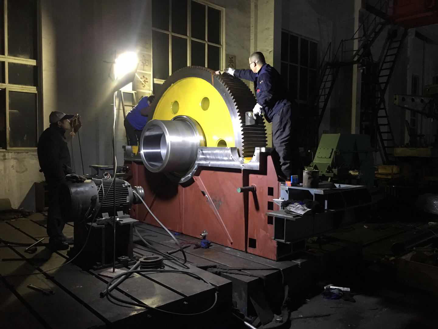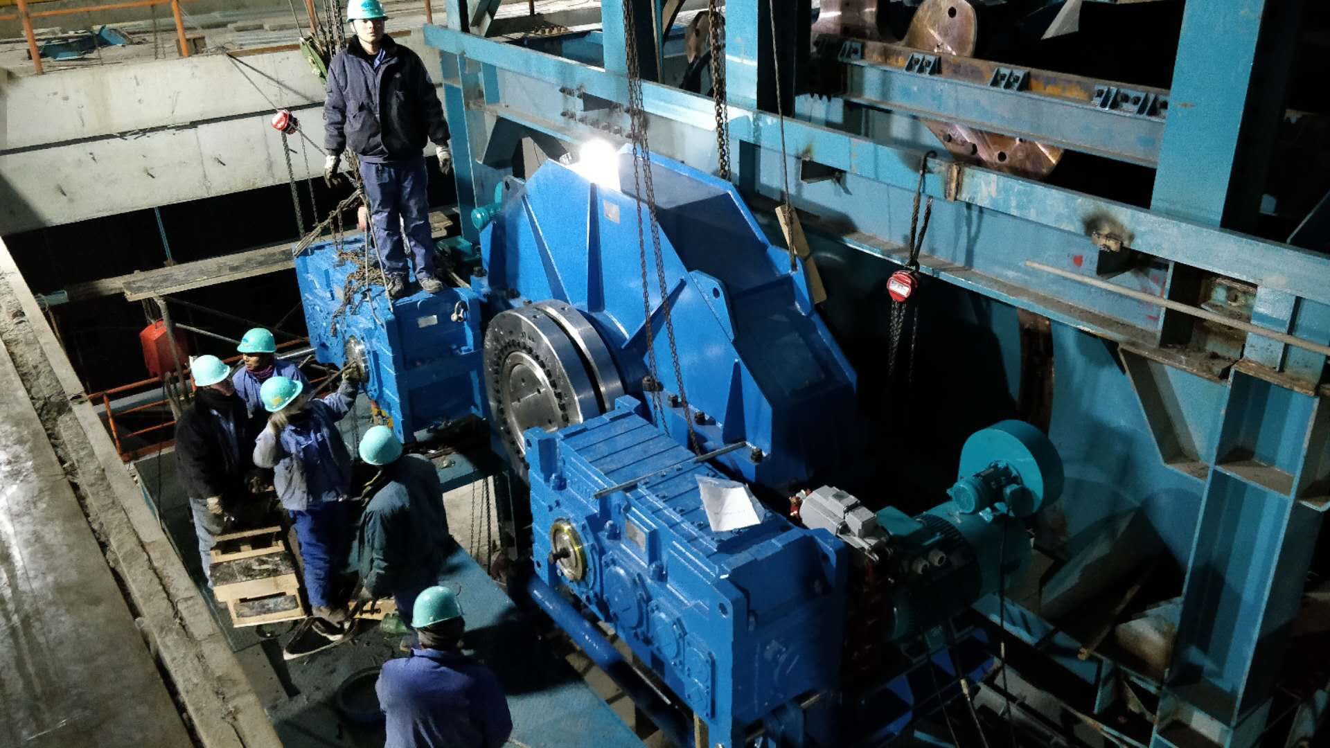 設備到場后,項目部根據(jù)之前制定的施工方案,連夜組織安裝隊伍卸車、安裝,安裝過程中,由于柔傳設備與燒結(jié)機頭輪設備為兩廠家制造,制造精度存在偏差,安裝前經(jīng)過反復測量還是發(fā)生了一次減速機在臨近完成穿軸工序時無法正常進行的狀況,此時已是第二天凌晨4點。項目部現(xiàn)場人員當即決定退出一次減速機進行處理后重新穿軸,待設備處理好第二次穿軸完成時已是第二天上午9點16分。期間,山冶設計日照燒結(jié)項目部、監(jiān)理人員24小時連夜督戰(zhàn),一刻都沒有休息,二十冶施工人員更是一鼓作氣完成了扭力桿、傳動電機、二次減速機的安裝,甚至吃飯都在現(xiàn)場臨時解決。電氣安裝人員與調(diào)試人員隨時待命,在設備安裝的同時穿插完成了電機的接線與調(diào)試工作。到下午6點18分,連續(xù)奮戰(zhàn)28小時后完成了整個柔傳設備的安裝調(diào)試工作,提前完成了預先制定的春節(jié)前施工任務。而在精品基地一期一步時,此安裝任務用了整整七天!這次僅用了28小時!